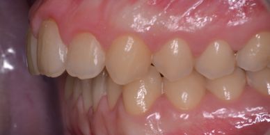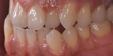 Deep Bite: (Excessive Overbite): The upper front teeth excessively overlap the lower front teeth, sometimes covering them completely or even biting into the gum tissue on the roof of the mouth.
